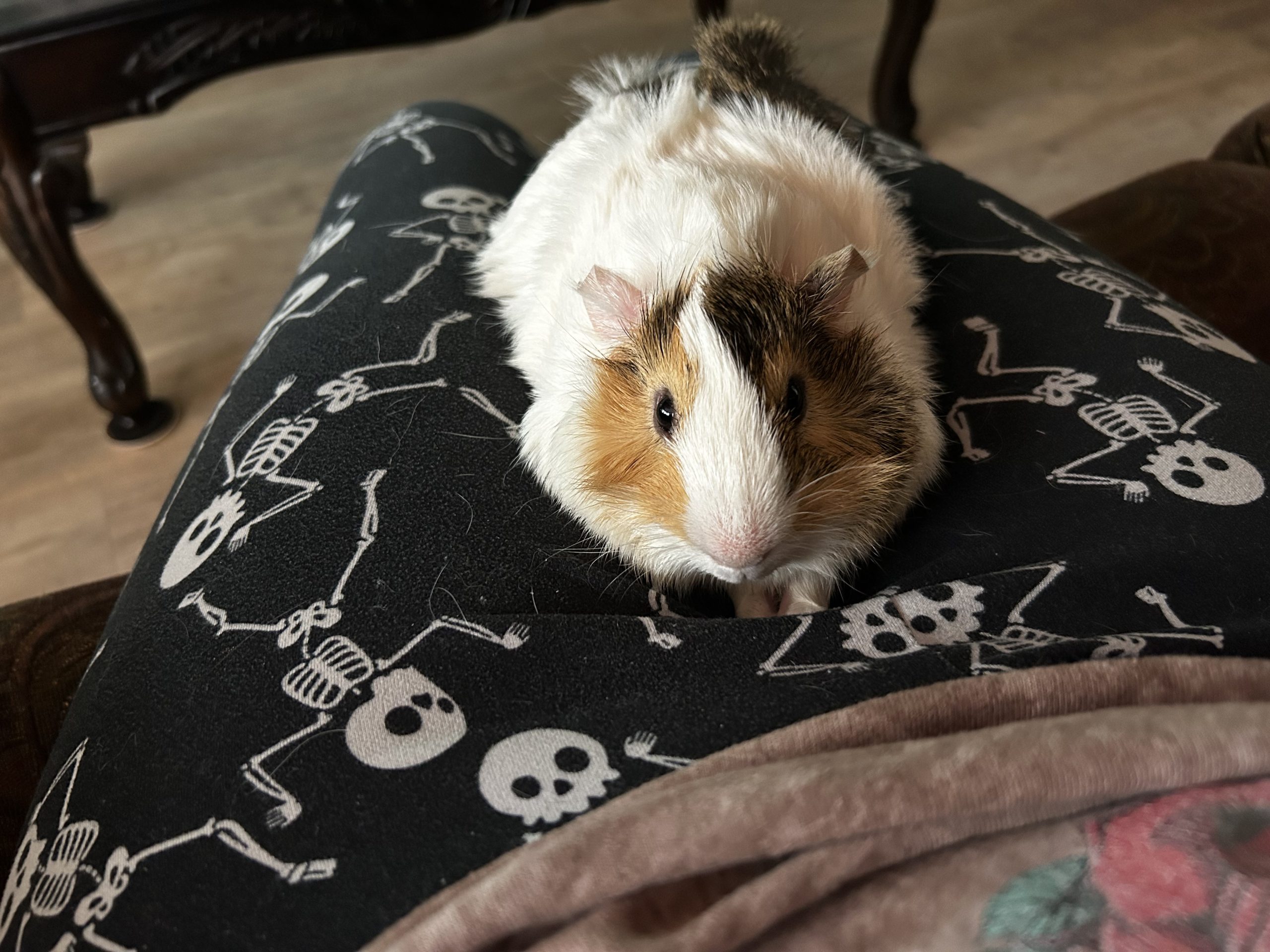 He loves floor time and lap time, fleece bedding, tunnels, and hideouts, and fresh veggies and treats.